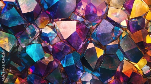 An abstract composition of enchanted gems arranged in a dazzling pattern, with light creating vibrant, shifting hues.