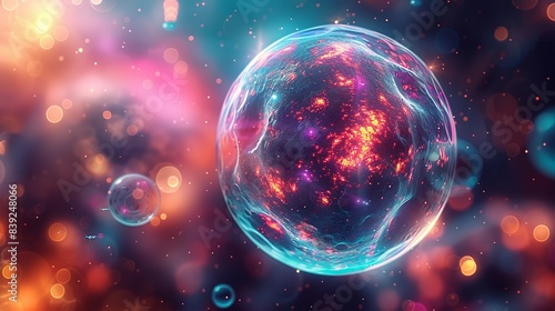 An abstract depiction of a cosmic bubble with vibrant colors and light, featuring tiny, peculiar life forms resembling a combination of insects and cells. Flat color illustration, shiny, Minimal and