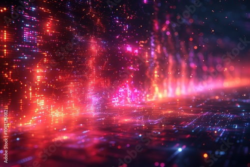 An abstract design with glitch effects, where random sections of the image are distorted, with bright neon