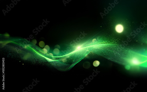 An abstract digital art piece featuring a flowing, luminous green wave against a black background with blurred lights.