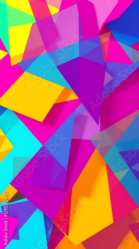 An Abstract Digital Artwork Featuring Vibrant, Overlapping Geometric Shapes In A Dynamic Composition, The Primary Colors Being Bold Magenta, Electric Blue, And Sunshine Yellow, Rende.
