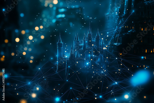 An abstract digital background featuring a castle, designed with intricate geometric patterns and a vibrant color palette.