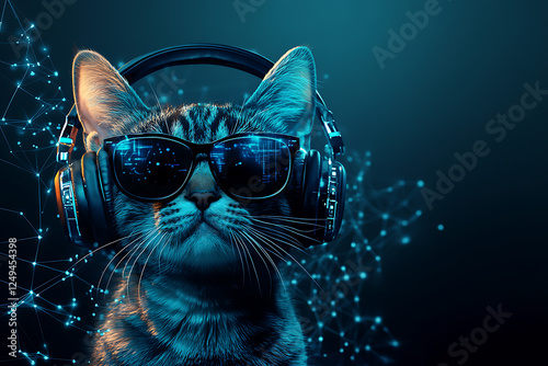 An abstract digital background featuring a cat in headphones and glasses, highlighted by futuristic connecting data points in blue and black colors