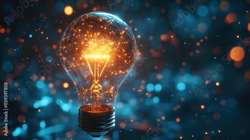 An abstract digital banner WITH POLYGONAL LINES with a light bulb with connecting data points in blue and black colors, BLACK background.