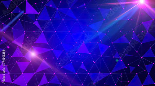 An abstract digital composition consisting of colorful triangular shapes connected by lines on a dark background, in vibrant neon shades of pink, blue and turquoise, giving it a futuristic look.