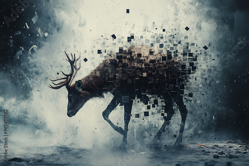 An abstract digital concept representing half of an animal dissolving into square pieces, symbolizing transformation or digital decay.