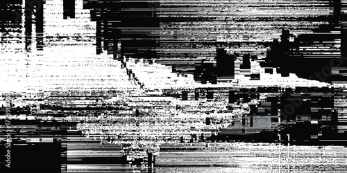 An abstract, digital glitch art piece rendered in black and white, Geometric pixel pattern of a digital glitch on transparent background.