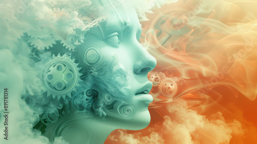 An abstract digital illustration of a human head with gears and abstract shapes, pastel colors, gradient shading