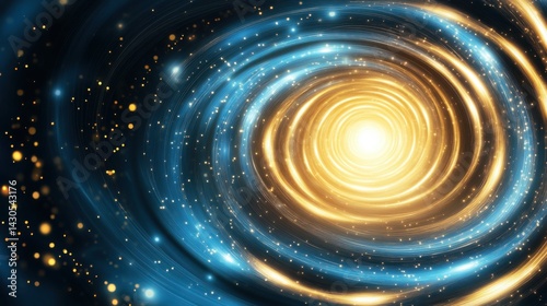 An abstract dynamic swirl of glowing blue and gold atomic particles creates a mesmerizing cosmic background perfect for futuristic designs and vibrant energy concepts.