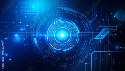 An abstract, futuristic background featuring a glowing blue circular interface with intricate circuit board patterns, data streams, and connecting lines, suggesting advanced technology.