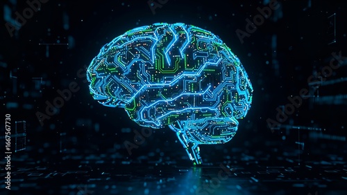 An abstract, futuristic brain with a circuit board design and glowing lights, symbolizing artificial intelligence and technology.