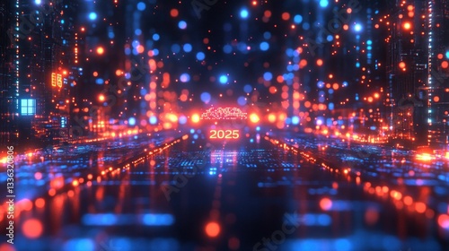 An abstract futuristic digital city displays the upcoming year of two thousand twenty five