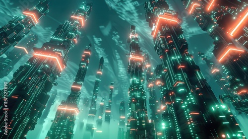 An abstract geometric landscape with towering structures made of glowing circuits and data streams