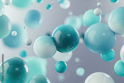 An abstract image featuring numerous translucent spheres in varying sizes and shades of teal and white, floating against a muted gray backdrop, creating a sense of depth and ethereal movement