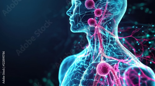 An abstract image of the human lymphatic system with glowing lymph nodes and fluid dynamics against a dark, neon backdrop, Neon style
