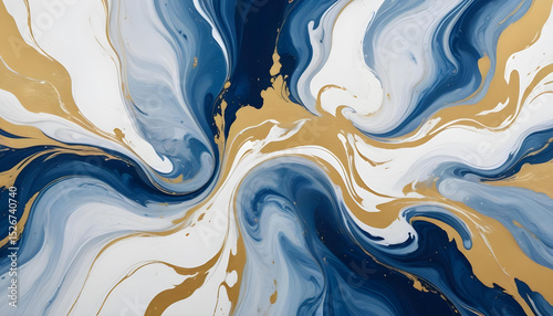 An abstract marble art piece in shades of blue, gold, and white, with flowing paint textures.