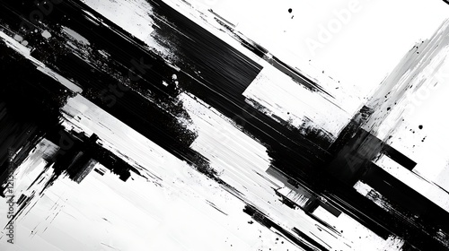 An abstract monochrome artwork features dynamic, gestural brushstrokes in black and white, creating a powerful and expressive visual composition.