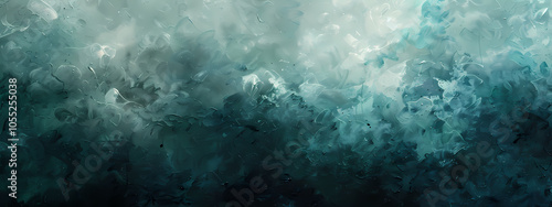 An abstract painting featuring swirling shades of teal and gray, creating a sense of depth and atmospheric movement.
