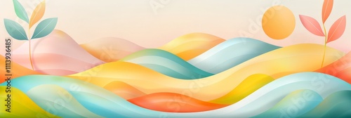 An abstract, pastel-colored landscape featuring soft rolling hills, a warm sun, and delicate plant illustrations in a dreamy, minimalist design.