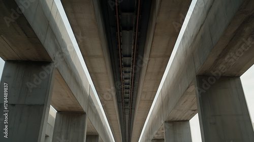 An abstract perspective looking up at an elevated structure, creating a symmetrical composition with concrete beams. Lines and angles create depth and dimension in this view.
