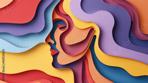 An abstract representation of a woman's profile is creatively formed using colorful paper cutouts, surrounded by flowing patterns and hues