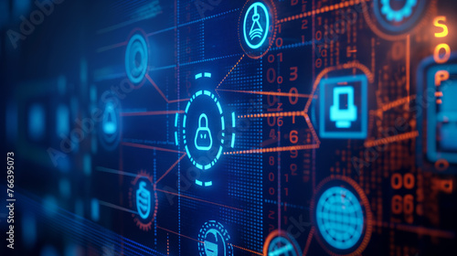 An abstract representation of technology, computer networking and cyber security. Blue abstract symbols.