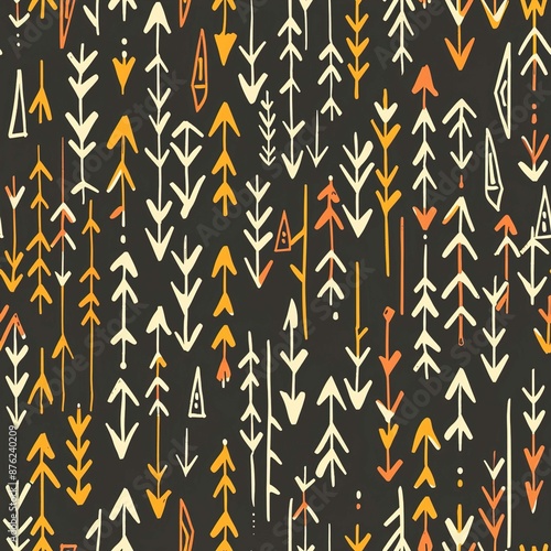 An abstract, seamless pattern featuring a variety of hand-drawn geometric shapes resembling stylized plants or arrows. The shapes are primarily in shades of orange, yellow, and cream against a dark gr