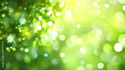 An abstract spring background showcasing green blurred bokeh lights.