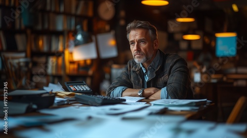 An accountant sitting at a desk cluttered with documents and a calculatora