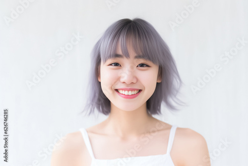 An adorable Asian girl, donning a bright smile, is elegantly photographed in her underwear against a pristine white backdrop. generative AI.