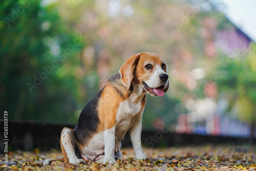 An Adorable Beagle Dog Sitting in The Park Setting Surrounded by Autumn Leaves