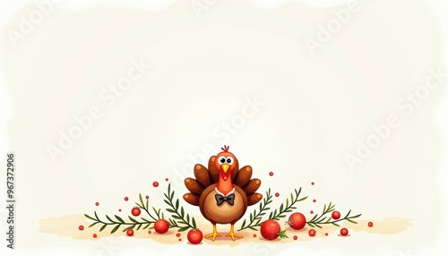 An adorable cartoon turkey adorned with a bowtie, surrounded by festive foliage and berries, perfect for Thanksgiving designs.