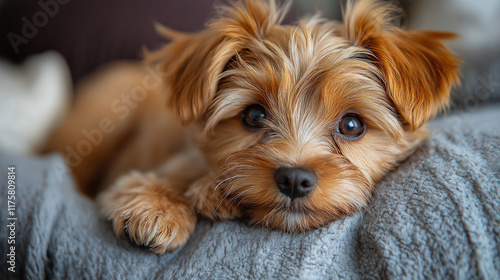 an adorable dog resting on a bed at home.