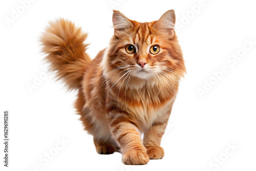 An adorable ginger maine coon cat with long fluffy fur walks forward, looking at the camera with curious yellow eyes, isolated on a transparent background