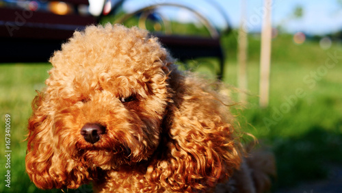 An adorable Poodle basking in the warm sunlight on a beautiful green meadow setting