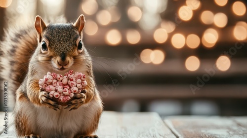 An adorable squirrel delicately grips a heart-shaped nut, set against a backdrop of twinkling lights, representing warmth, curiosity, and festive delight.