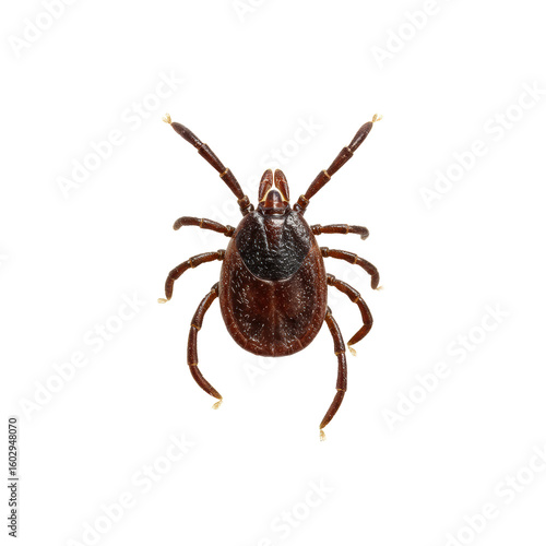 An adult dark brown ixodes tick, deer tick, displaying its eight segmented, splayed legs and subtly engorged abdomen, isolated on a transparent background with shadowless studio lighting, ultra