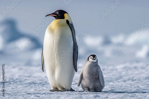 An adult emperor penguin stands beside a fluffy gray chick on a snowy landscape. The scene captures the bond between parent and offspring in a cold environment.