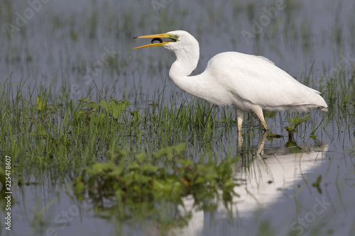An adult Great egret (Ardea alba) swallowing a larva in a nature reserve in Poland. .