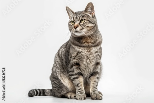 An adult grey tabby cat is seated alone on a white background. Generative AI