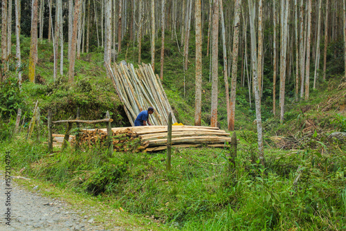 An adult man dressed in a blue t-shirt and pants with a wheat-colored complexion is cutting down pine trees with a yellow chainsaw to gather wood for the construction of houses, bases, beds, etc. He d