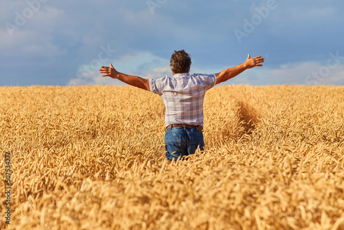 An adult man in a farm field among ripe cereals and raised his arms to the sides.