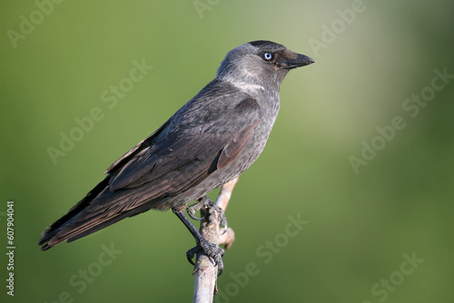 An adult western jackdaw (Coloeus monedula) is shot very close up on a thin branch against a blurred green background from an unusual angle