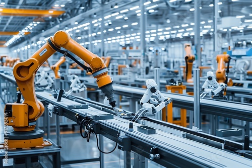 An advanced robotics factory with assembly lines producing sleek, modern robots, precision tools and machinery in motion, in a clean, organized, and efficient industrial space