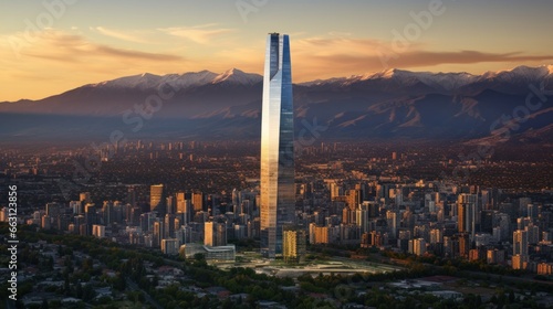 An aerial perspective capturing the sunset's golden glow casting a radiant reflection off a towering skyscraper, framed by the sprawling cityscape, while the majestic Andes Mountain