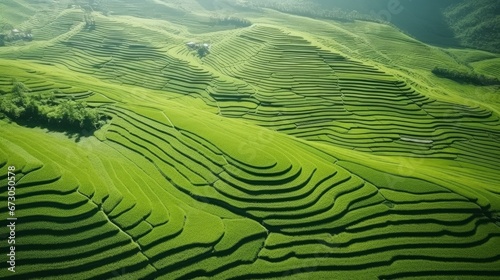 An aerial perspective of lush agricultural fields featuring rice and tea crops. This picturesque landscape provides a beautiful and textured background suitable for tourism, design