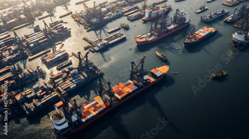 An aerial shot of a bustling harbor with large ships and fishing boats