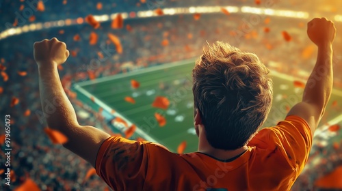 An aerial shot of a football stadium filled with cheering fans, with one particularly excited supporter in the foreground, arms raised The vibrant atmosphere of the stadium and the sea of supporters