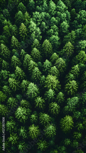 An aerial view captures the dense green canopy of a forest Sunlight dapples the treetops creating a vibrant textural l