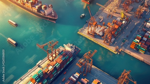 An aerial view of a bustling logistics hub with cranes loading ships, and trucks and planes ready for transport, illustrating the coordination of global trade